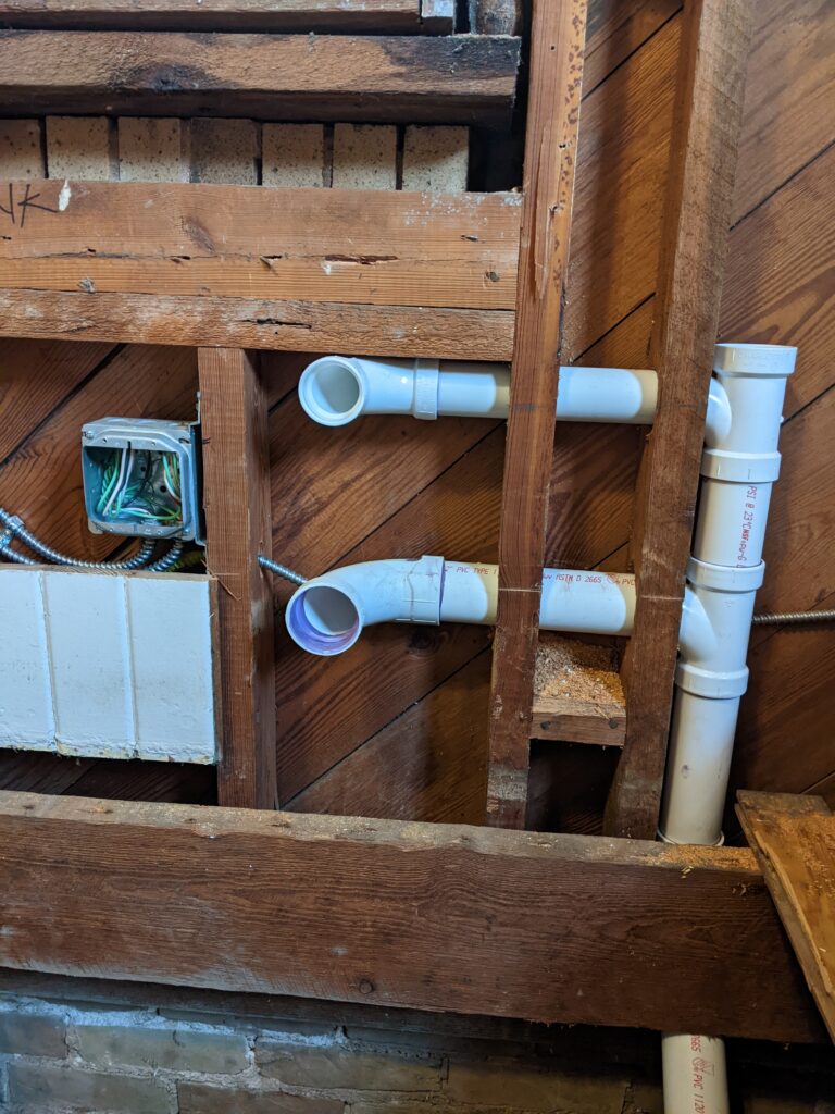 Inside the kitchen, old drain pipes are being removed and new ones connected.