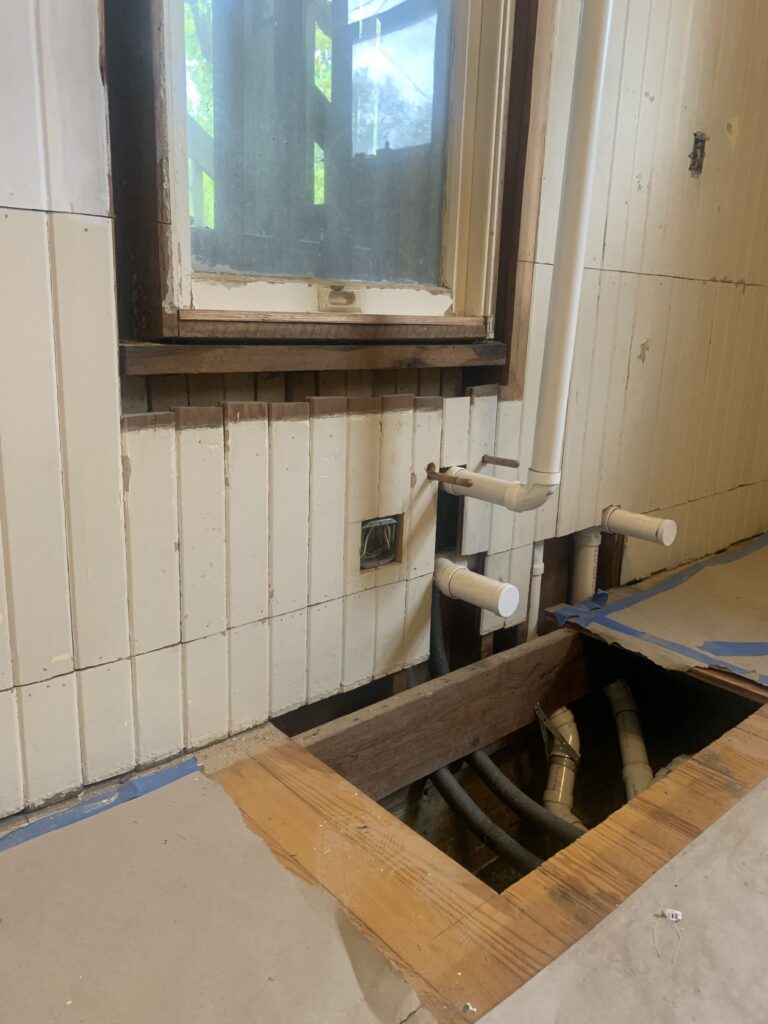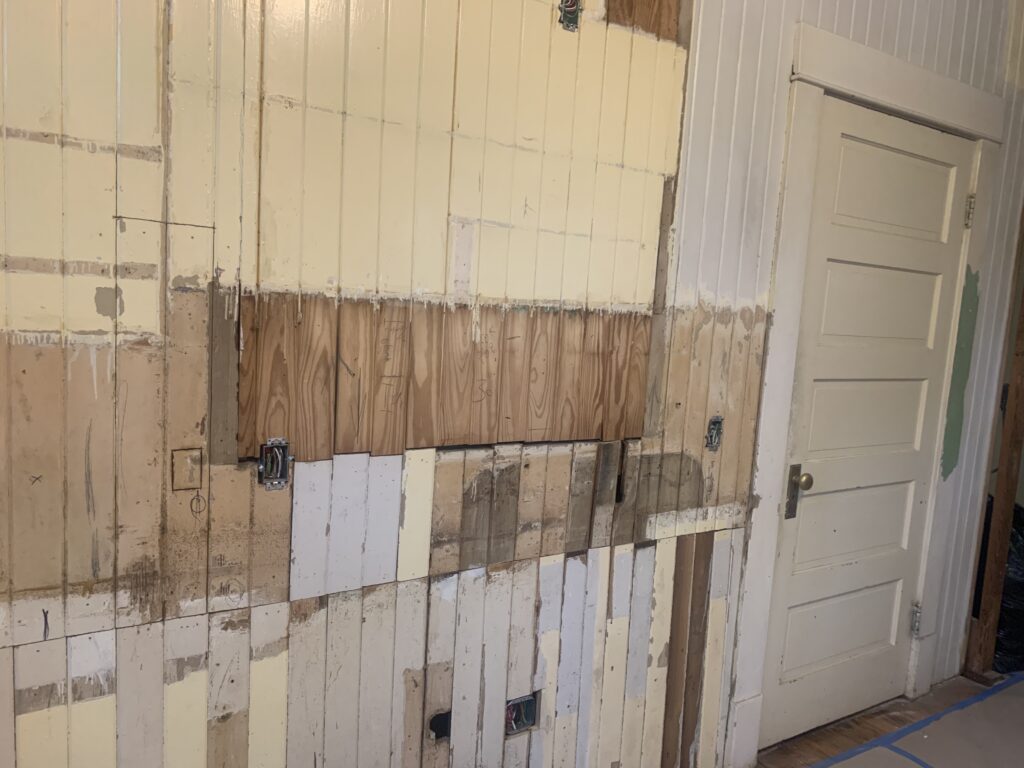 Now that the city has passed us on the rough plubming inspection, the contractors have begun to replace the sections of wall that were removed for that installation. We hope to finalize the cabinet order this week. While we wait for the cabinets, the plan is to begin stripping the thick layers of paint that have accumulated on the walls over the years.