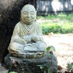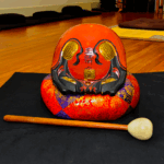 A small version of Buddha’s patched robe, suspended from cloth straps and worn around the neck. Usually, each person sews their own and receives it from the Preceptor during Jukai, the ceremony of receiving the Bodhisattva precepts. Lay persons and priests wear rakusu in different colors. The back of rakusu is inked with the student’s Dharma name, their teacher’s name, the date and place of the ceremony, and sometimes a verse or image.