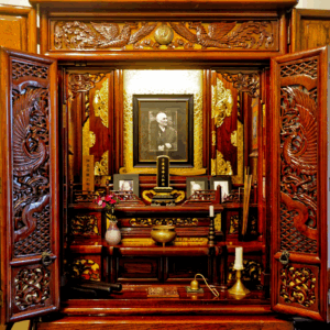 The Founder’s Hall, a memorial building or shrine for the founder of a temple. At AZC the kaisando is a large cabinet at the top of the stairs and holds a photograph and memorial tablet for our founder, Zenkei Blanche Hartman, who passed away on May 13th, 2016. Photos of deceased SFZC abbots and paintings of the two founders of Japanese Soto Zen, Dogen Zenji and Keizan Zenji are also housed in the kaisando. It is respectful to pause and bow to the kaisando when you pass it and its doors are open.